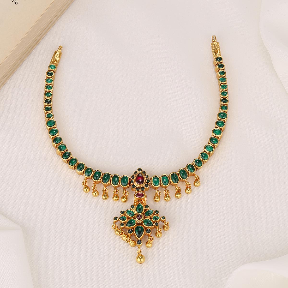 This 92.5 Silver, 24 kt gold-plated, stylish Necklace is studded with semi-precious stones to make a stunning statement. Perfect for any special occasion.