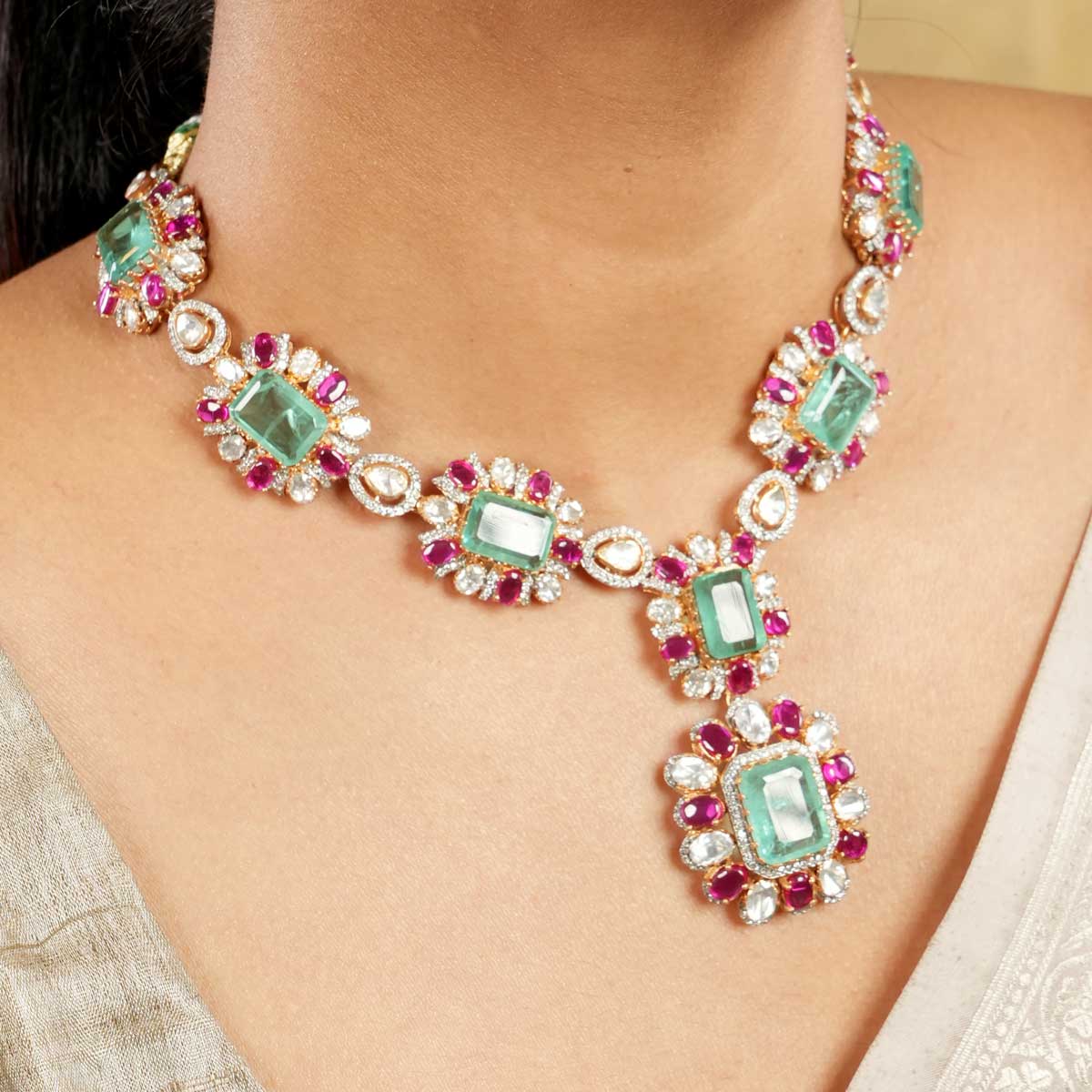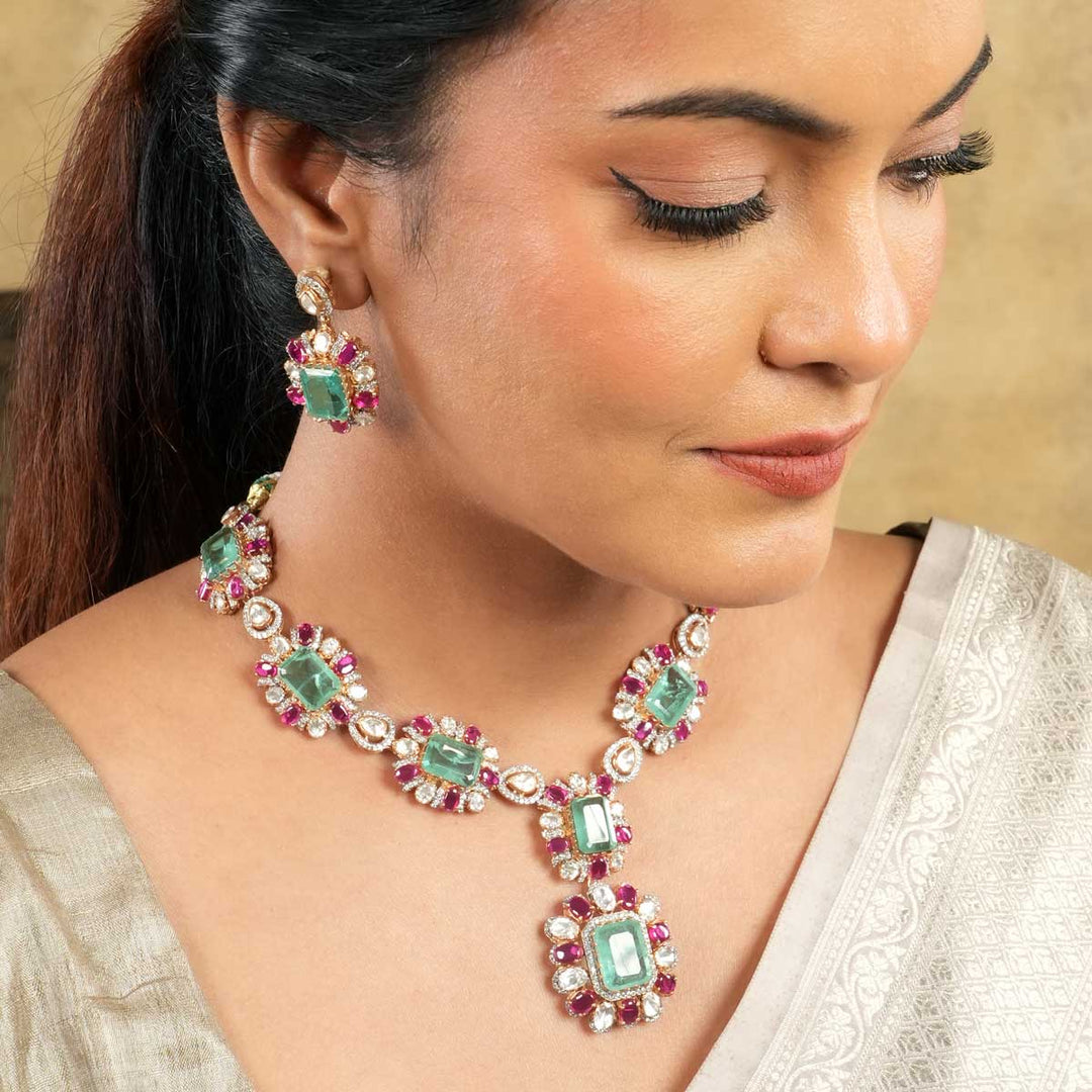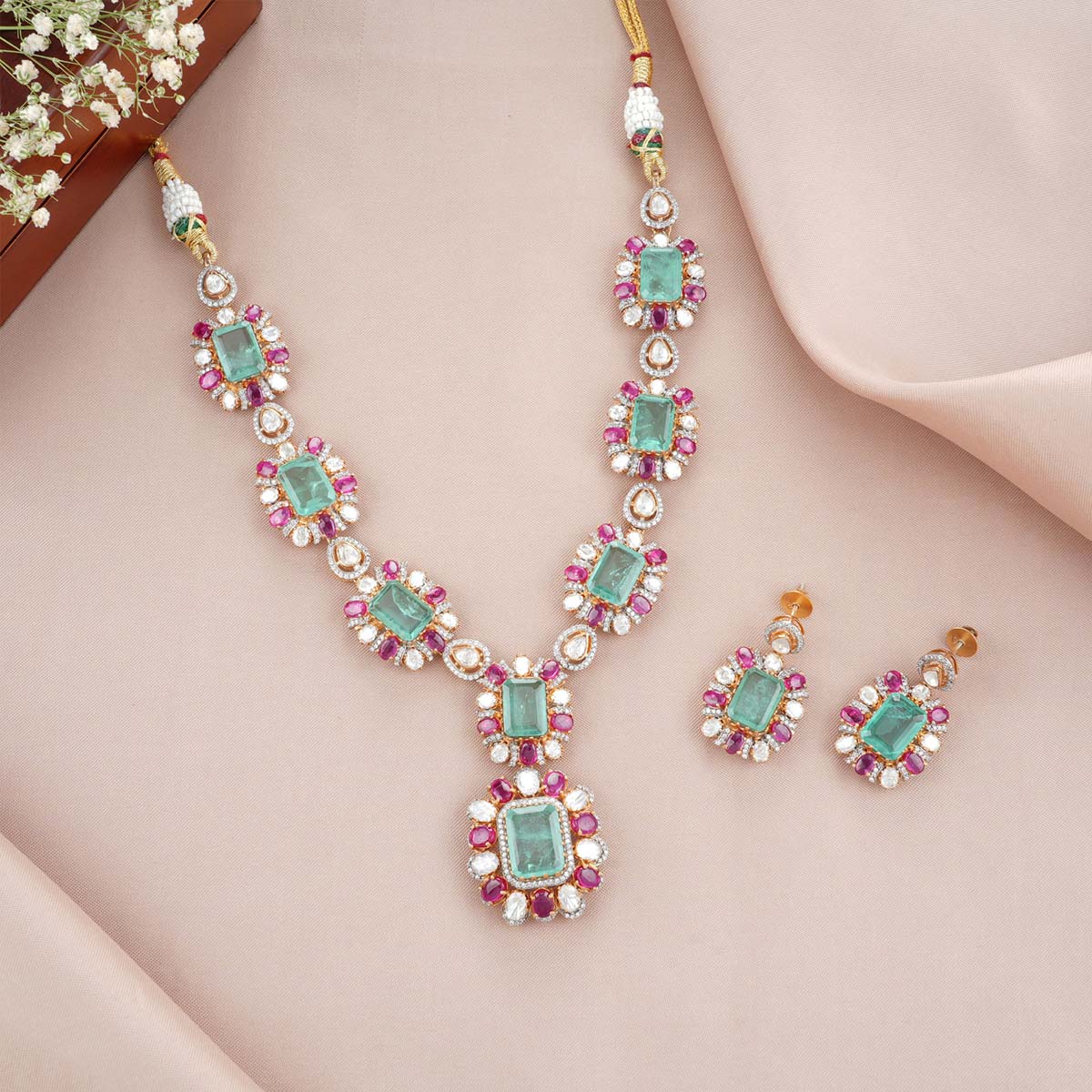 92.5 Silver, Victorian Necklace set studded with Gem Stones and Pearl Beads.